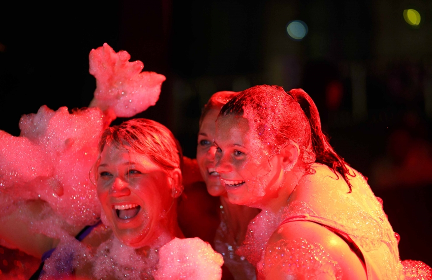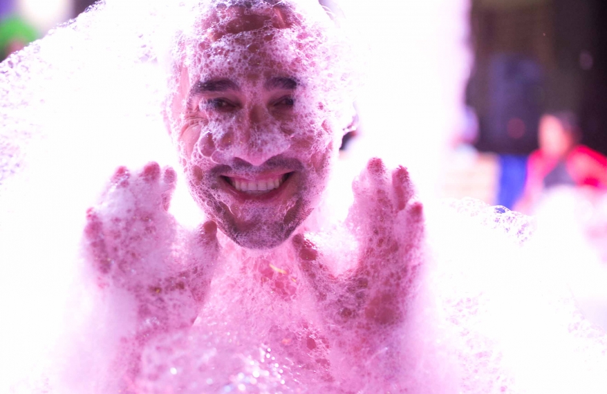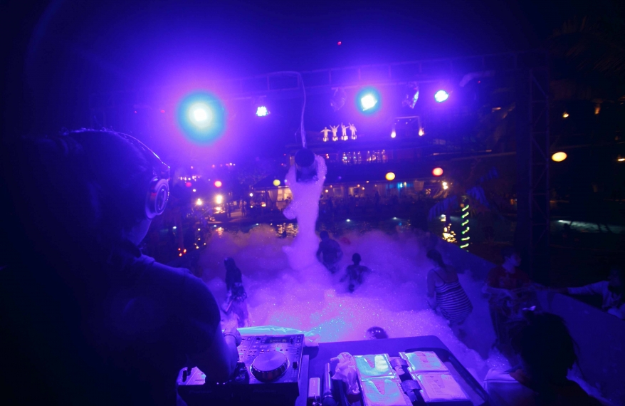 The dance floor is a six-by-eight-metre giant tub covered in about four feet of foam, and there’s no age limit to enter. In place of a spinning glittery disco ball hangs a foam machine, a compact cannon-like box that sprays a continuous stream of thick foam to fill the dance tub. Preparation for a foam party at night starts early at 11am with the setting up of the dance tub and DJ console. After lunchtime comes the installation of lighting and audio equipment. It’s then time to prepare the winning ingredient—foam. To produce a continuous stream of foam that runs for two hours, about 25 litres of foam liquid is needed, mixed with 1,000 litres of water. The staff, having tested various options, decided on one that’s scent-free, gentle on the skin and doesn’t sting the eyes. The foam liquid is pumped through two hoses which feed into the foam machine that churns out a continuous stream of froth for two hours.