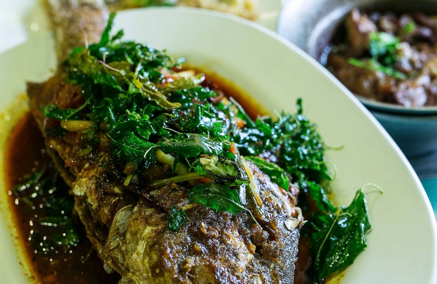 This large and unpretentious restaurant features a mix of Thai and Chinese dishes on its menu, which are well and above ordinary. These include the deep-fried fish in local sauce (pictured above), homemade deep-fried stuffed crabmeat rolls, or Hoy Jor, the baked pork knuckle with garlic, as well as the oyster omelette featuring lump oysters enveloped in egg batter.