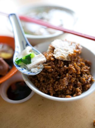 Our mouths water as we tuck into the bowl of yam rice in front of us. Yam rice relies heavily on the quality of yam and is cooked with rice, dried shrimps and dark sauce. The texture was comforting—soft yet powdery with cubes of yam and tasted of home. It is served with a variety of soups from bittergourd to yong tau foo (stuffed bean curd with fish paste), but it is the kiam chye soup with pork meatballs and innards which takes the cake.