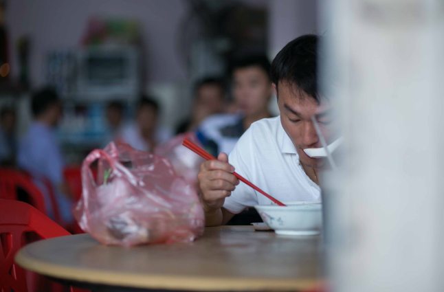 Our tastebuds awoken, we take a short drive towards Beng Huat Asam Fish Chicken Rice, another eatery adored by the community for its chicken rice with assam fish soup. We arrive to the hustle-bustle of owner Li Beng Huat, 40 and his crew of five busy chopping and frying away. With his white beard, Mr Li cuts quite a character (his face is used as the shop’s logo).